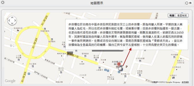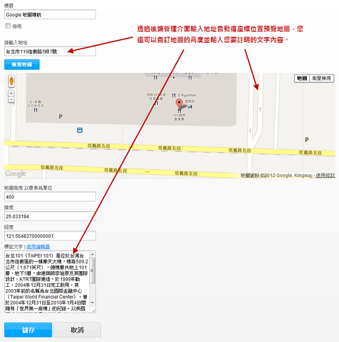 ● 可以運用本模組系統在網頁內設定動態可縮放的Google地圖導覽